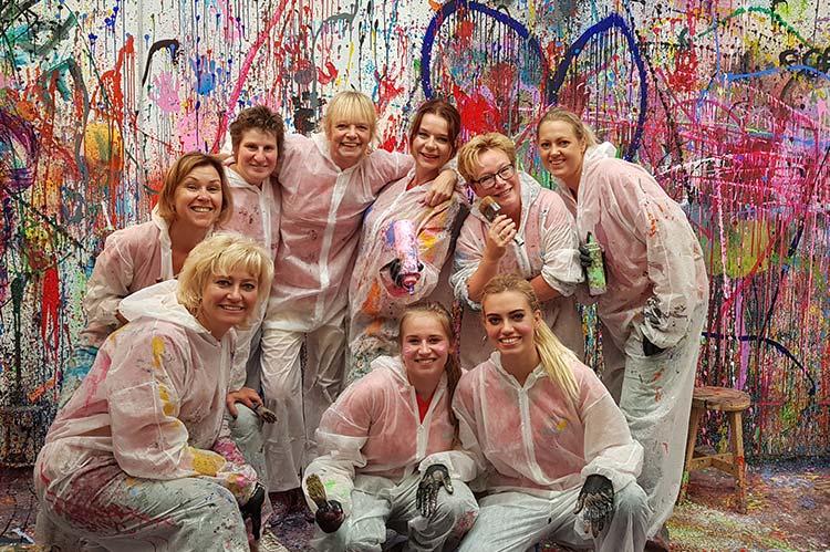 Bij het feestje draag je een spatdichte wegwerpoverall om de kleding te beschermen, maar oude of makkelijk wasbare kleding wordt aangeraden omdat de verf niet uit de kleding gaat. De workshop vindt plaats in een grote, goed geventileerde ruimte met airconditioning, ideaal voor elk seizoen. Zowel jongens als meiden kunnen deelnemen, en het feestje is ook geschikt als teambuilding of bedrijfsuitje.